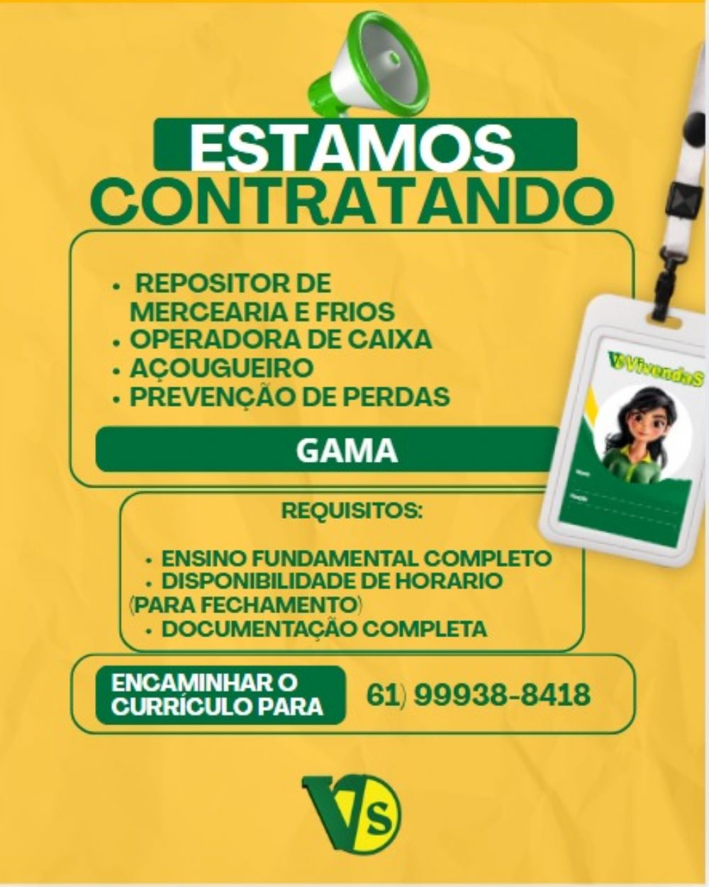 Vagas de emprego para Repositor de Mercearia e Frios, Operadora de Caixa, Açougueiro e Prevenção de Perdas no Gama