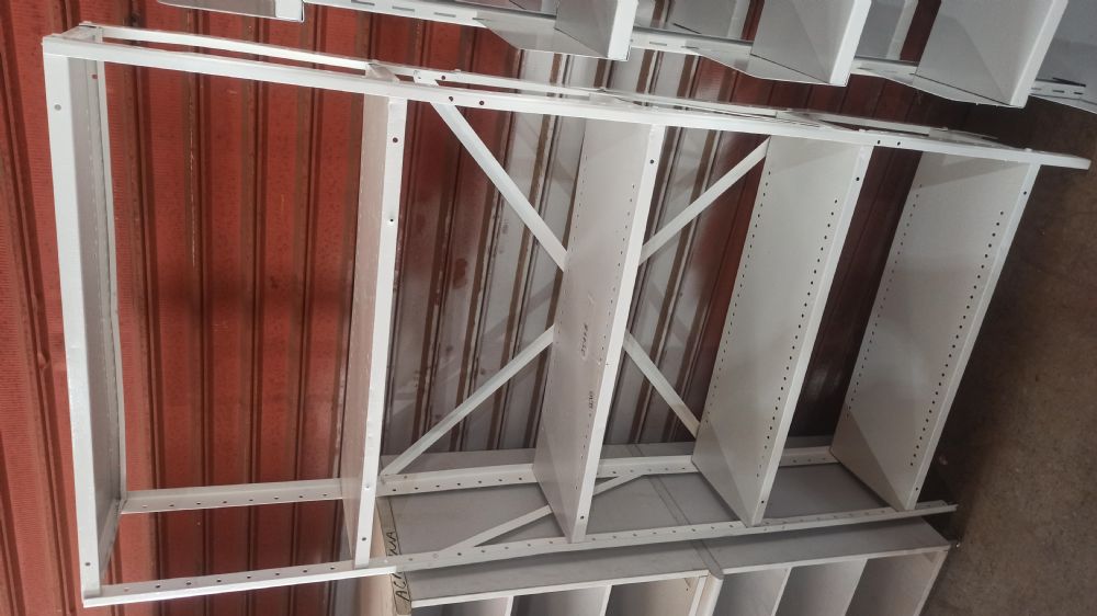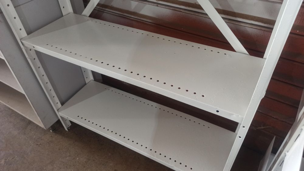 Estante metálica branca com 5 prateleiras ajustáveis.