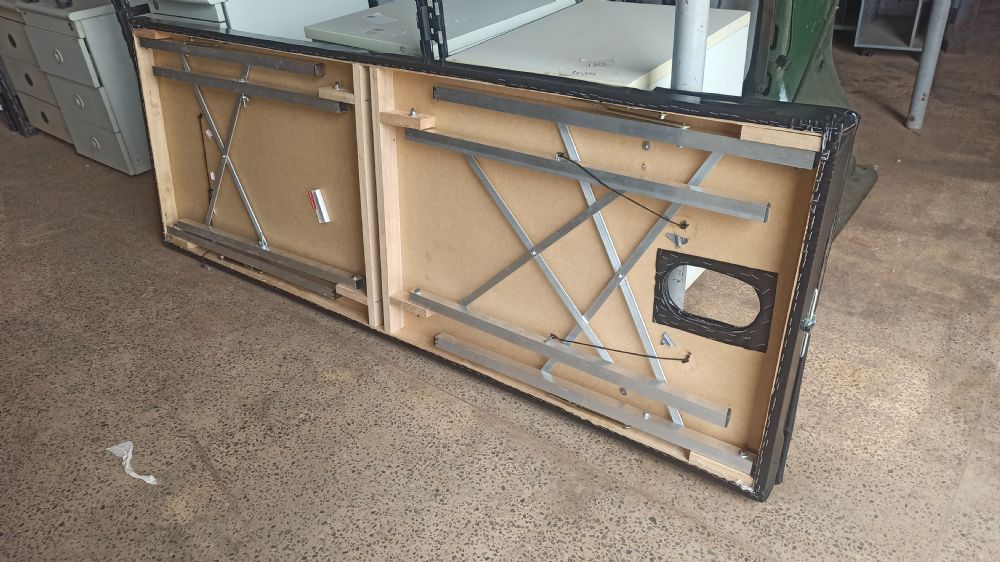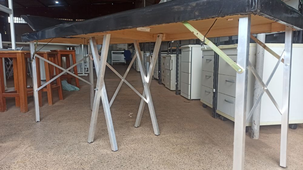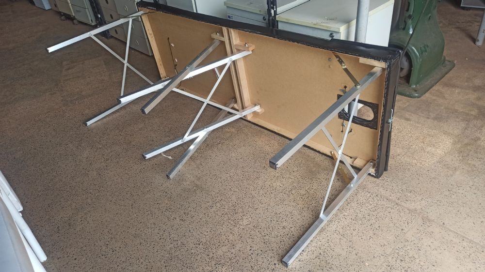 Maca dobrável com estrutura em alumínio e estofado preto.